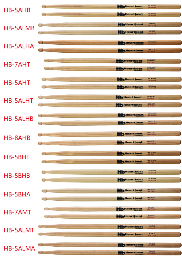 Part numbers made easy: HB-5AMT is Heartbeat 5A size, Maple wood, Teardrop tip. -L for lacquered. -12 for twelve pack.